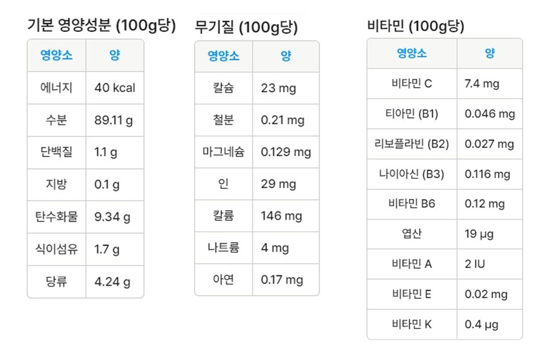 양파는 낮은 칼로리에 다양한 비타민과 미네랄을 함유하고 있어 건강에 좋은 식품입니다. 또한, 양파에는 항산화 물질도 포함되어 있어 여러 건강 이점을 제공할 수 있습니다. 이 표는 양파 100g당 대략적인 영양성분을 보여줍니다.