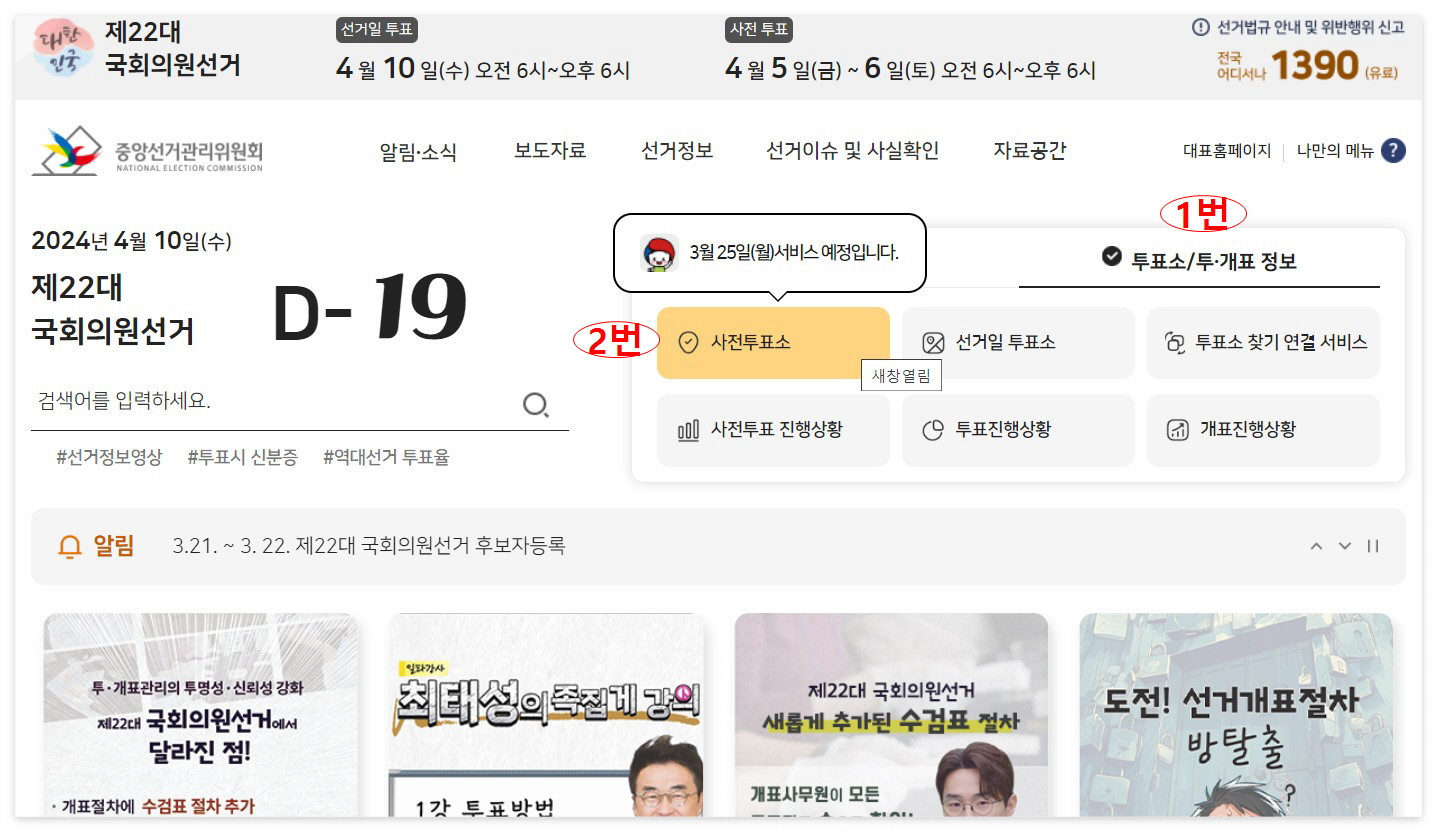 사전투표장소를 찾으려면 우선 선거관리위원회 홈페이지에 들어가셔서, 오른쪽 상단 박스에서 1번 '투표소/투 ·개표정보' 클릭한 뒤, 2번 '사전투표소' 순서대로 클릭하셔서 찾으시면 됩니다. 현재는 '3월 25일부터 서비스예정입니다'로 나오니, 3월 25일부터 검색하시면 됩니다. 아래 사전투표장소 찾기 이미지를 클릭하시면 편하게 바로 연결됩니다.